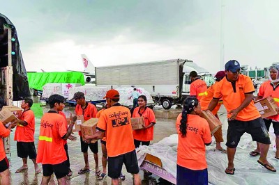 4月11日,中国政府向缅甸提供的第六批紧急人道主义地震救灾援助物资抵达仰光国际机场。这批物资包括帐篷、单人户外炊具、太阳能阅读灯、香皂、沐浴露、洗发水、牙膏、牙刷、洗衣粉等,总重超91吨。本报驻仰光记者 陈晓阳摄/光明图片