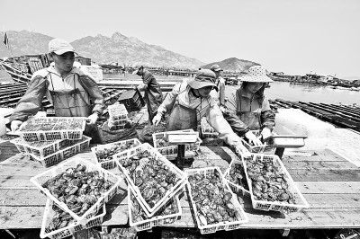 近日,在福建省福州市连江县黄岐半岛周边海域的渔排上,渔民们正热火朝天地收获鲍鱼,近5亿粒春鲍经过一年的成长收获上市。图为4月11日,渔民收获鲍鱼。新华社记者 姜克红摄