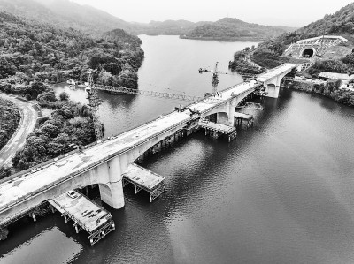 4月12日,由中铁五局承建的成渝中线高铁全线控制性工程玄天湖双线大桥顺利合龙。玄天湖双线大桥全长460.561米,位于重庆市铜梁区玄天湖4A级景区内,环保要求高,施工难度大。新华社记者 唐奕摄