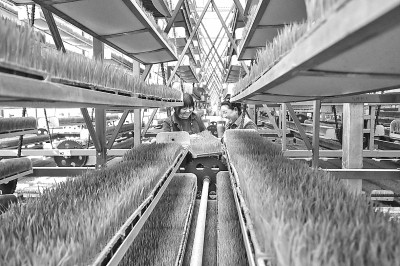 近年来,河南省光山县引进全自动智能化育秧技术,鼓励育秧工厂推广订单式育秧模式,为全县部分种植水稻合作社、家庭农场、种田大户育秧提供保障,“订单式”育秧助力春耕生产提质加速。图为4月13日,在光山县罗陈乡张楼村青龙河合作社,社员正在全自动智能化育秧工厂管护水稻秧苗。谢万柏摄/光明图片