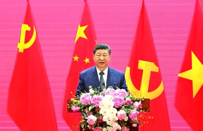 4月15日上午,中共中央总书记、国家主席习近平在河内国际会议中心同越共中央总书记苏林、越南国家主席梁强共同会见中越人民大联欢活动代表。这是习近平发表题为《奏响睦邻友好主旋律 共谱命运与共新篇章》的致辞。新华社记者 申宏摄