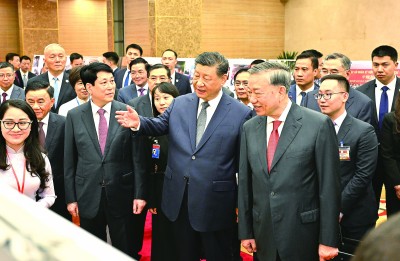 4月15日上午,中共中央总书记、国家主席习近平在河内国际会议中心同越共中央总书记苏林、越南国家主席梁强共同会见中越人民大联欢活动代表。这是活动前,习近平在苏林、梁强陪同下,观看中越建交75周年图片展。新华社记者 殷博古摄