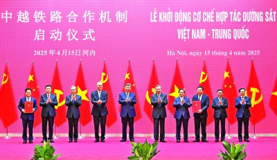 4月15日上午,中共中央总书记、国家主席习近平在河内国际会议中心同越共中央总书记苏林、越南国家主席梁强共同会见中越人民大联欢活动代表。这是活动后,习近平同苏林、范明政共同见证中越铁路合作机制启动仪式。新华社记者 殷博古摄