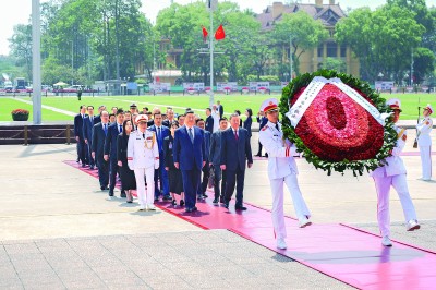 4月15日上午,在越共中央总书记苏林陪同下,中共中央总书记、国家主席习近平瞻仰胡志明陵并敬献花圈。新华社记者 燕雁摄