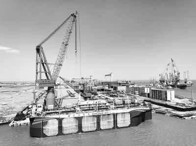 在江苏南通通州湾高端装备临港产业园,全球首艘漂浮式动力定位全域化网箱型工船“湛江湾一号”近期下水。“湛江湾一号”集海上半潜养殖、自主航行避台、绿色能源供给、智能控制等多项功能于一体。图为4月14日拍摄的“湛江湾一号”。许丛军摄/光明图片
