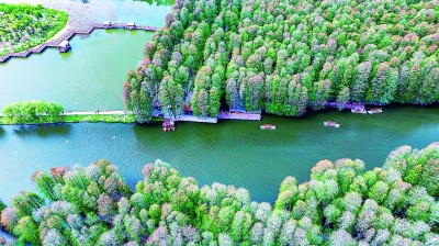 近日,江苏省兴化市里下河国家湿地公园春花烂漫,景色怡人,众多游客泛舟水上,畅游春日林间,乐享春光。图为4月16日,游客在公园乘坐竹筏游玩。周社根摄/光明图片
