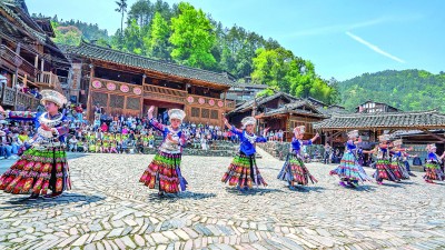 贵州省黔东南苗族侗族自治州雷山县郎德苗寨依山傍水,风光秀丽,木质吊脚楼沿山势层叠分布,构成一幅美丽的田园山水画卷,每年吸引大量游客前来感受苗寨秘境。图为4月16日,游客在郎德苗寨游玩,沉浸式体验原生态的苗族风情与文化。朱红生摄/光明图片