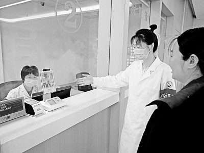 取消门诊预交金政策实行后,绍兴市不少医院上线了新的医疗支付方式。图为日前,当地越城区东湖街道社区卫生服务中心工作人员指导患者使用新系统完成缴费。叶嘉璐摄/光明图片