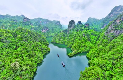 4月19日,雨后的湖南张家界市武陵源区宝峰湖,青山叠翠,绿水清幽,游人乘船徜徉山水间。吴勇兵摄/光明图片