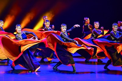 4月21日,为期4天的第七届内蒙古舞蹈大赛在呼和浩特市启幕,涵盖民族团结、文化传承、生态保护、乡村振兴等时代主题的100部参赛作品分别参加专业组和群文组项目比赛。图为内蒙古锡林郭勒盟西乌珠穆沁旗乌兰牧骑参赛演员表演群舞《北疆碗韵》。王正摄/光明图片