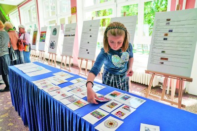 4月19日,一名女孩在波黑萨拉热窝举行的甘肃民间艺术展上挑选明信片。为庆祝“国际中文日”,以“中国非遗 世界共享”为主题的甘肃民间艺术展当天在萨拉热窝大学哲学院开幕。