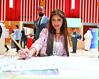 4月20日,参与者在科威特哈瓦利省举行的“国际中文日”暨使馆开放日活动中体验中国书法。