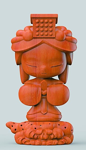一些莆田木雕艺术家尝试将城市天际线、数字科技图案或现代服饰等元素以抽象或具象的方式融入作品中,创造出既具有传统韵味又富有现代感的艺术形式。这种创新不仅丰富了木雕的艺术语言,也使其在视觉上更符合现代审美需求。笔者曾设计一款木雕文创产品“恬妈”,既是一个小香炉,又融合了卡通潮玩风格,颇受年轻人喜爱。