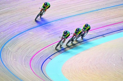 4月26日,2025年中国场地自行车联赛第三站在河南省洛阳市体育中心自行车馆拉开帷幕。图为参赛车手在比赛中。李卫超摄/光明图片