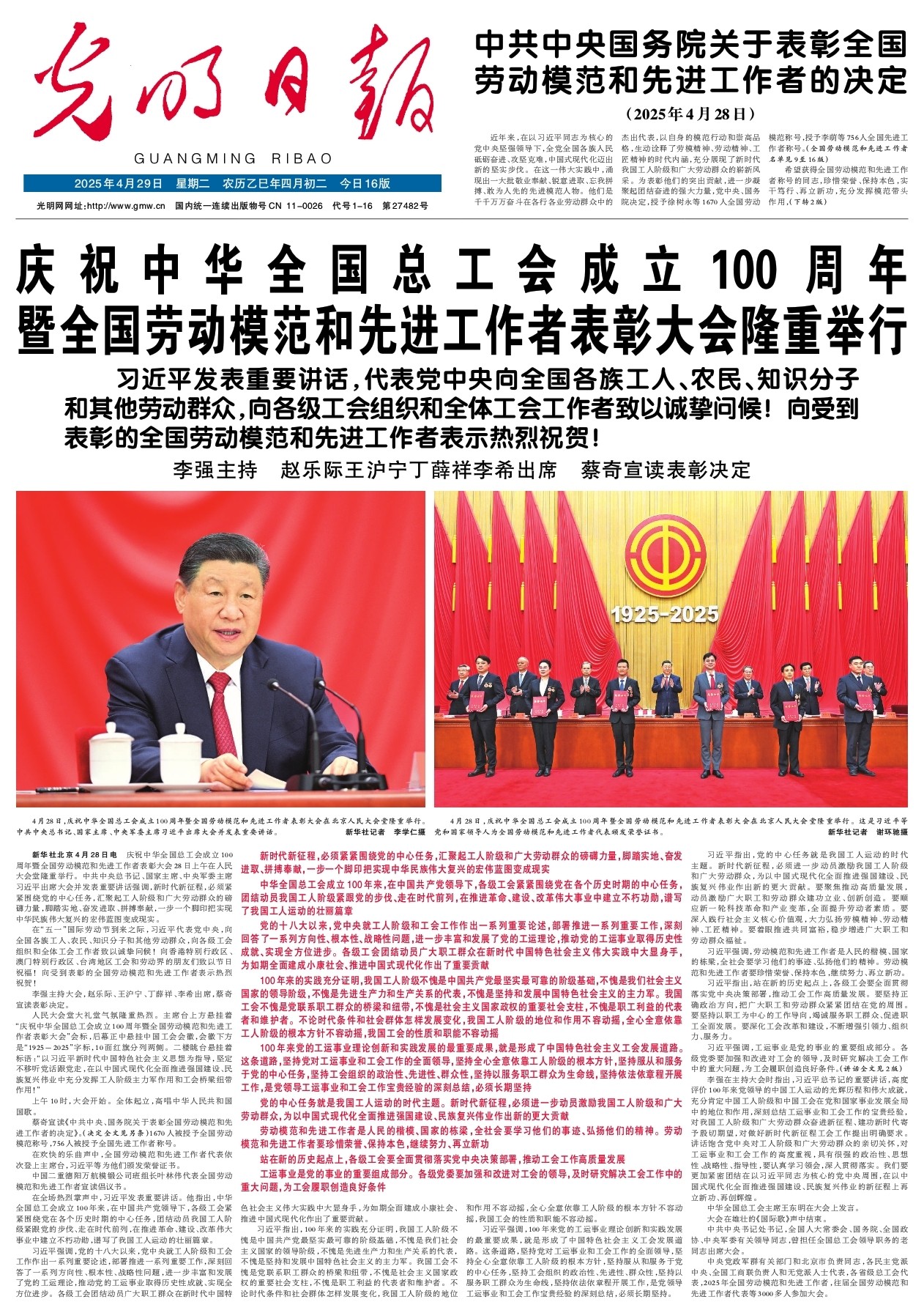 庆祝中华全国总工会成立100周年暨全国劳动模范和先进工作者表彰大会隆重举行