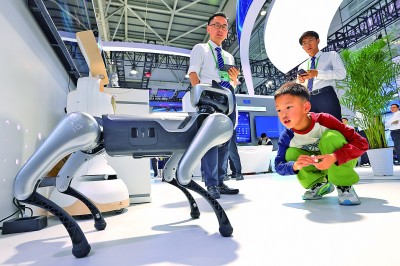 4月28日,第八届数字中国建设峰会现场体验区在福建福州海峡国际会展中心正式开放。据了解,今年的现场体验区首次设立低空经济专区,集中展示30多项“数据要素+低空经济”的创新技术和应用;现场推出超过100个体验互动项目,汇集百余台智能机器人产品。图为小朋友在第八届数字中国建设峰会体验区与智能机器狗互动。王旺旺摄/光明图片