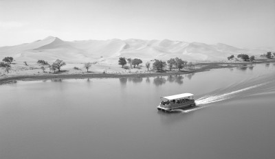 4月27日,新疆巴音郭楞蒙古自治州尉犁县罗布湖“沙水”兼容,水天一色,美景如画,吸引游客纷至沓来。罗布湖位于塔克拉玛干沙漠东北部,是依靠塔里木河河水形成的一个自然湖泊,集沙漠、胡杨、河流、湖泊于一体,生态环境优美。汪志鹏摄 光明图片