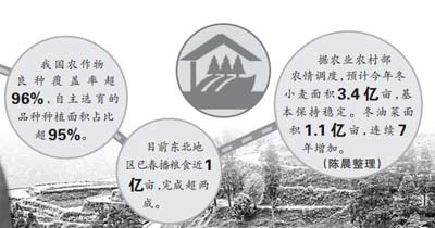 稳住种植面积,才能稳住粮食生产的底盘。各地各部门从补贴、保险等惠农政策入手,健全收益保障机制,充分调动农民种粮积极性。广东广州早在2018年就出台了专门针对粮食生产大户的支持政策,逐年增加财政资金补贴;云南西双版纳勐海县为种粮大户发放财政统筹奖补资金;安徽合肥扎实推动政策性农业保险扩面提质,进一步提升农户种养积极性……今年,国家继续加大对粮食生产的支持力度,提高小麦、早籼稻最低收购价,稳定玉米大豆生产者补贴和稻谷补贴,实施稻谷、小麦、玉米完全成本保险和种植收入保险全覆盖政策,为实现粮食产量1.4万亿斤左右的目标提供政策保障。