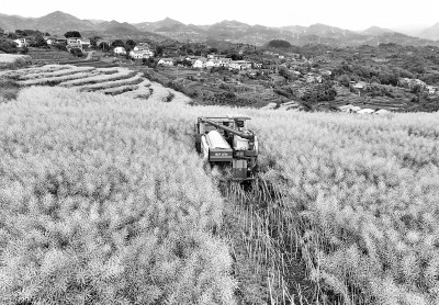 近期,我国部分地区油菜进入收获期,农民抢抓农时,收获油菜。图为5月5日,收割机在重庆市北碚区三圣镇是平村收割油菜。新华社发
