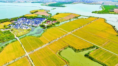5月7日,江苏省昆山市锦溪镇顾家浜村小麦长势喜人,从空中俯瞰,一片金黄,丰收在望。袁新宇摄/光明图片