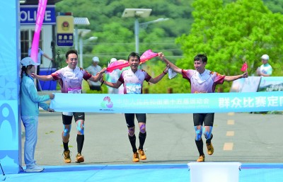 5月8日,第十五届全国运动会群众赛事活动定向接力赛决赛在广东省茂名市高州根子镇举行,广东队以1小时43分19秒夺得男子定向接力赛冠军,摘得十五运会群众赛事首金。图为广东队选手李卓业(中)、唐建达(左)、唐潇在男子定向接力赛中冲向终点。新华社记者 黄国保摄
