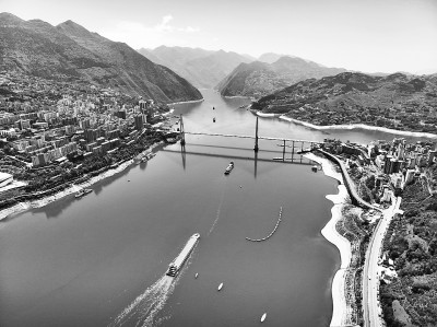 近日,湖北省恩施土家族苗族自治州巴东县,长江生态廊道与两岸青山、江面船舶勾勒出一幅山水画卷。焦国斌摄/光明图片