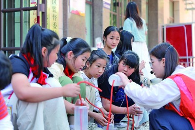 5月12日是第17个全国防灾减灾日。近日,各地开展形式多样的防灾减灾宣传教育及演练培训活动,提高人们科学防灾意识和灾害避险自救能力。图为5月11日,学生在河南省焦作市温县岳村街道慈胜社区防灾减灾宣传活动现场学习制作抛绳器。 新华社发
