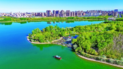 5月10日,甘肃省张掖市芦水湾旅游度假区绿意盎然,市民和游客乘游船画舫游览美景。杨永伟摄/光明图片