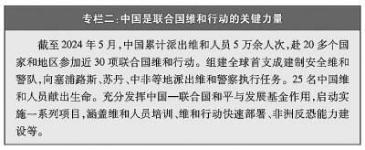 坚定支持联合国提高维和行动履行授权能力。中国是联合国第二大会费国、第二大维和摊款国,也是安理会常任理事国第一大维和行动出兵出警国。支持联合国在国际反恐斗争中发挥中心协调作用,在全球数字治理和规则制定方面发挥主导作用,支持世卫组织在全球卫生事务中发挥领导协调作用,支持联合国教科文组织推动全球教育、科技、文化发展,促进文明交流互鉴、包容合作。