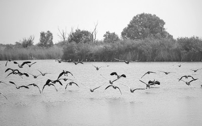 初夏时节,位于山东省东营市的黄河三角洲国家级自然保护区绿意盎然、生机勃勃。图为5月14日,一群大雁在黄河三角洲国家级自然保护区内飞翔。 新华社记者 徐速绘摄