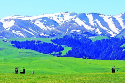近日,新疆伊犁哈萨克自治州伊宁县的托乎拉苏草原进入盛花期,杉林草原、天山白雪构成一幅自然美景,吸引游客前往。阿尔达克·拜斯汗摄/光明图片