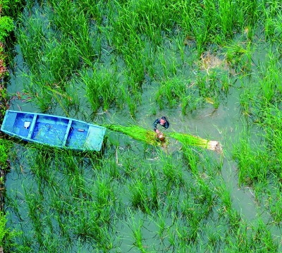 采蒲工人在淮安大运河百里画廊月湖中采摘蒲菜。
