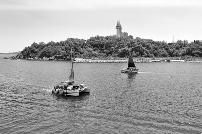 5月19日,游客在山东省烟台市芝罘区烟台山景区附近海域乘船观光。新华社发