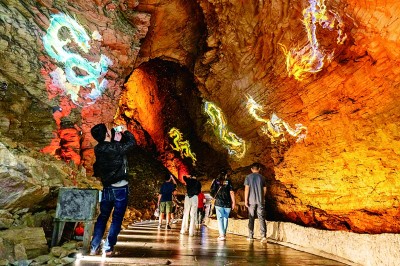 5月20日,湖南张家界黄龙洞景区灯光升级工程正式竣工亮相。此次灯光升级改造以“洞天福地”为主题,以“大鲵化龙”故事为引线,把天然石壁当成巨幕,将光影科技、神话故事和自然景色融为一体,为游客们打造了一场关于光影、神话与自然的奇幻之旅。图为游客在张家界黄龙洞景区游览拍照。新华社记者 陈思汗摄