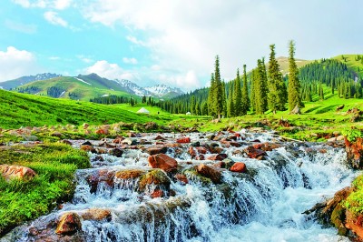 5月23日清晨,新疆那拉提草原上的溪流奔涌。位于天山环抱伊犁河谷之中的那拉提草原绿意盎然,迎来一年中的最美时刻。新华社发
