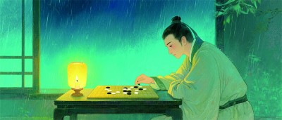 画面中,一盏昏黄的灯映照着散落的棋子和半开的棋盘,灯花轻落,增添几分诗意。背景以深色调为主,营造出深夜的宁静氛围,而微妙的光影处理则突出了等待中的闲适与淡淡惆怅。整体风格简约,通过细腻的笔触和柔和的色彩过渡,传递出古人雅致的生活情趣和悠然自得的心境。