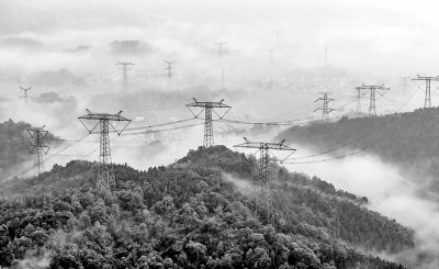 5月24日,安徽省池州市贵池区墩上街道罗城村,“西电东送”特高压输电通道电网与晨雾、山峦和乡村相映成景,构成了一幅壮丽的生态画卷。何清摄/光明图片