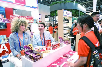 观众在塞尔维亚展区品尝特色饼干。本报记者 阮紫嫣摄/光明图片