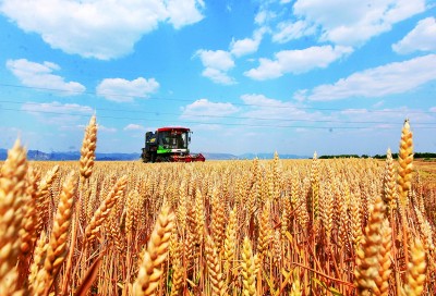 5月24日,在山东省临沂市平邑县地方镇,农机手驾驶收割机在田间收割小麦。新华社发
