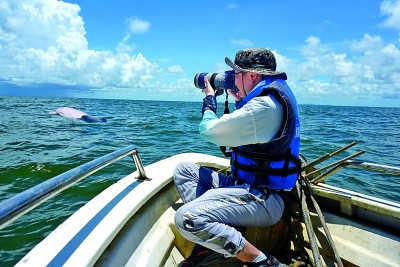 突然,海面泛起一阵水花,一条巨大的布氏鲸跃出水面,头顶喷出一蓬水柱,随后拱起后背,镰刀一样的背鳍和尾鳍划破海面,带起一片浪花后,旋即又从金灿灿的海面上消失。陈默兴奋地说:“每次看到布氏鲸,都像见到老朋友一样亲切。”