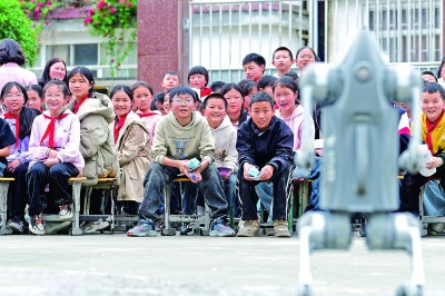 5月28日,云南省昭通市大关县“背篼图书馆”志愿服务队和大关县科学技术协会志愿者来到翠华镇庆云小学,为学生们带来丰富的课外活动。学生们参与科普问答、观看四足机器人表演等,在欢乐的氛围中迎接“六一”儿童节。图为学生们观看四足机器人表演。新华社记者 高咏薇摄