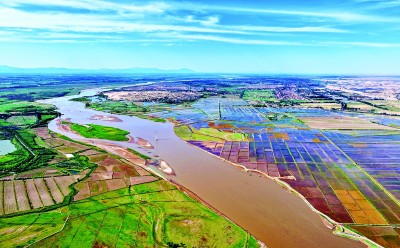 6月3日,俯瞰位于宁夏回族自治区银川市兴庆区月牙湖乡的黄河银川段,奔流不息的河水与两岸稻田、和美村庄构成了一幅美丽的生态图景。袁宏彦摄/光明图片