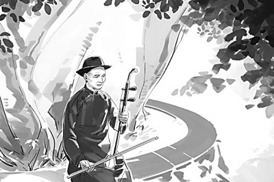 只见肖南京一袭硬挺的蓝布盘扣长衫,头戴黑圆礼帽,手中握一把朱红色二胡。远观,竟似从遥远的时光里走来。近看,他的相貌也有些高古,肤黑,额头略凸起,双目深陷,面露盲人特有的沉静之气。