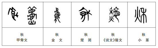 说到秋天,我们就会想到丰收的景象,这从“秋”字的左半边“禾”可见一斑。禾就是庄稼。但“秋”右边的“火”有何义?是秋天干燥易失火,还是秋天农人烧秸秆?这些回答都有道理。若能解读“秋”的古字形,隐藏其中的自然奥秘便会解开。甲骨文的“秋”就是一只虫子,长长的触须酷似蟋蟀。《诗经·豳风·七月》:“七月在野,八月在宇,九月在户,十月蟋蟀入我床下。”可见蟋蟀对气候极为敏感,其鸣叫与活动规律是古人判断秋季的重要依据。蟋蟀从七月在田野逐渐迁徙至屋内,十月钻入床下,这一轨迹恰好对应夏秋转凉的时序,甲骨文通过描绘蟋蟀长须、长足的特征,以“虫鸣秋至”的意象传递季节信息。蟋蟀叫,秋天到,且其“啾啾”声与“秋”读音相近,先民可能用拟声法将虫鸣与季节命名结合——这是多么浪漫的事!再看“秋”甲骨文另一字形,下为火形,上为虫形,即用火烧虫子,这符合当时农事习惯。《诗经·小雅·大田》载:“去其螟螣,及其蟊贼,无害我田稚。田祖有神,秉畀炎火。”意为农户为除害虫(螟、螣、蟊、贼),用火驱逐它们。朱熹《诗集传》说:“必去此四虫,然后可以无害田中之禾。”“故愿田祖之神为我持此四虫,而付之炎火之中也。”秋天是蝗虫活跃期,蝗灾会严重影响庄稼收成,殷商甲骨文中有诸多相关记载,如:“癸酉卜:蝗其出,于田?”还有“宁秋”“告秋”等禳灾记载,如:“庚辰贞:其宁秋?”“甲申卜,宾贞:告秋于河?”其中“宁秋”是乞求祖先或神灵止蝗灾,“告秋”是告祭于先王先公或河、岳等神以消灾。1976年在河南安阳妇好墓出土的玉蝗器物,印证了殷商先民对禳除蝗灾的重视。我国先民除祭告神灵外,还采取积极的灭虫办法,最有效的便是火烧,这一做法保留在甲骨文字形中。直到今天,我国农村仍保留秋天焚烧秸秆灭虫肥田的农事活动。“秋”的籀文字形也蕴含着古代文化密码,关键就在右边的“龟”。商周时期,秋天是献龟的法定时节,《周礼·春官·龟人》载“龟人掌六龟之属”“凡取龟用秋时”,说明商周统治者每年秋天接受各地进贡的龟,以保证占卜活动顺利进行。因此,《说文》籀文字形虽与早期形体不同,却反映了时代变化下人们对“秋”的不同认识。