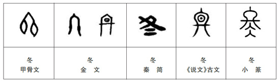 比起“秋”,“冬”的字形更抽象,但其造字同样讲究且富有文化内涵。甲骨文中,“冬”像绳子两端打结之形,表示终结。冬天是四季之终,故借用此形表示冬天。“冬”即“终”,这在很多古代典籍中可以得到证明:《说文·仌部》:“冬,四时尽也。”“尽”即“终”;《广雅·释诂四》《汉书·律历志上》皆言:“冬,终也。”《白虎通·五行》:“冬之为言终也。”《释名·释天》:“冬,终也,物终成也。”金文中,字形多与甲骨文一脉相承,但在《陈章壶》中出现另一字形,与《说文》古文如出一辙:将开放的绳结变为封闭的绳结,然后将“日”放入其中,看似把太阳关了起来,实则表示日光即将终结。显然,这里的日光终结并不是“莫”(暮)的日暮之义,而是指冬天光照不足的自然现象,正所谓“冉冉晨雾重,晖晖冬日微”(宋·晁公溯《隆州道中》),以冬日光照不足表示冬天之义。小篆把太阳从字形中移除,下部加“冰”的古字“仌”,表现冬天的寒冷,正所谓“立冬之日水始冰,又五日地始冻”(《逸周书》)。小篆“冬”用绳结和“仌”强化字义,让人一看到字形就想到“冬天”。后来,“冬”下的“仌”简化为两点,仍表寒冷——从两点水的字多与冰冷有关,如“冬”“冰”“冻”“寒”“冷”“凛”“冽”等。那么问题来了,既然“冬”后来只表冬天义,那么“终结”义如何表达?古人在原字形“冬”旁加“糸”,以“丝尽”表终结义。此外,冬天农事渐渐停止,有“冬闲”“农闲”之说,“牢”字也能反映此义。《说文·牛部》:“牢,闲,养牛马圈也。从牛,冬省,取其四周帀也。”需要注意,“牢”字小篆上面不是“宀”,而是“冬”的省略,取“冬闲”之义和“四周帀”之形。冬天不仅农人停止劳作,牲畜也会得到休息,所以牛马进牢(圈)得闲,正所谓“战马春放归,农牛冬歇息”(白居易《偶作二首》)。