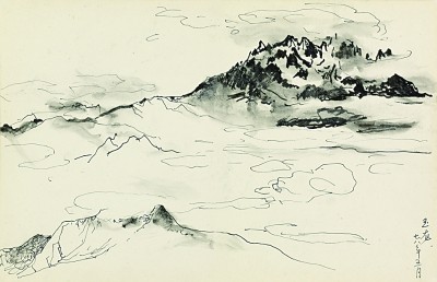 其间,吴冠中连续一个多星期冒雨在玉龙雪山写生,只为捕捉雪山最真实的面貌与气韵。他顶风冒雨,衣履尽湿,却始终不曾放下画笔。在他的艺术人生中,这是一次饱含虔诚与执着的山水朝圣,也是一场属于画者与自然之间的深情凝视。那些诞生于雨雾之中的作品,被他视作珍宝。《云南行》中描绘玉龙雪山的速写写生有7张之多,每一幅都显现出他对自然万象的敏锐感知和独到表现。他用灵动的线条勾勒出雪山连绵起伏的脊线,笔触轻盈而不失力度,极具节奏韵律。与传统山水画不同的是,他运用现代构成理念,将“写意”与“写形”融为一体。在描绘雪山氤氲雾气时,他更是以指代笔,用沾有淡墨的指腹在纸面上反复揉搓,形成云气缭绕、山色朦胧的视觉效果,使画面呈现出介于具象与抽象之间的微妙张力。这些速写作品中,黑与白的碰撞、线与面的交融、动与静的对比,被吴冠中巧妙地组织在有限的画幅中,构成强烈的视觉节奏与空间起伏感。他擅长在“空”中见“实”,以极简的笔墨营造出极富厚度的山岳氛围,使玉龙雪山在画中呈现出既高远又飘逸、既雄浑又婉约的多重表情。这种速写风格并非单纯记录景致,更是吴冠中艺术理念的深度体现,速写不在于速,而在于写——写境、写神、写意。他的速写,是创作的“胚胎”和“构思之母”,更是自由心灵的产物。