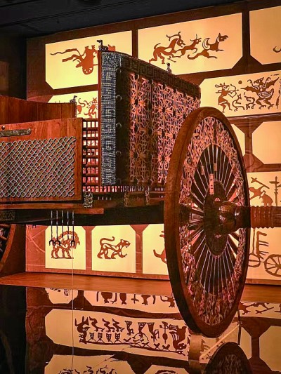 展览中,有一件天水马家塬遗址出土马车的复制品,车辆工艺精湛,饰以华丽金银,呈现典型的西戎风格。车辆的所有者很可能是为秦人从事贸易的戎人。秦人逐渐强大后,将戎人纳入自身经济社会体系。
