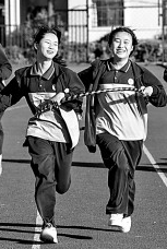 河北省秦皇岛市新世纪高级中学高三学生体验趣味游戏“松鼠搬家”。