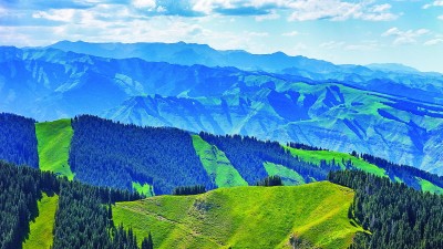 6月7日,新疆昌吉回族自治州呼图壁县南部天山山脉呈现一派生机,松树苍翠,林木葱茏,风光如画。陶维明摄/光明图片