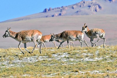 每年5月至7月,藏北高原羌塘国家级自然保护区内的雌性藏羚羊进入迁徙繁殖季。图为一群雌性藏羚羊在羌塘国家级自然保护区核心区内迁徙(6月10日摄)。新华社记者 刘金海摄